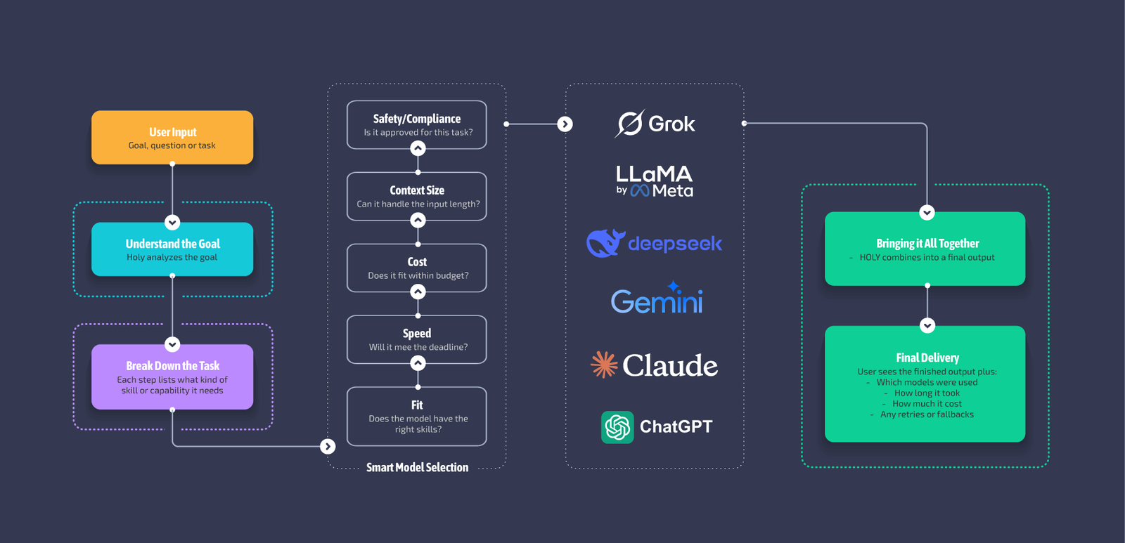 Automatically selects and connects to the best LLM models for each step of your task.