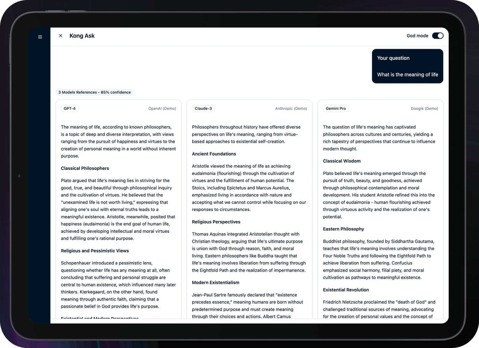See multiple AI perspectives side by side. God Mode compares responses from different large language models (LLMs), giving you deeper insights, varied viewpoints, and more reliable answers to complex questions.