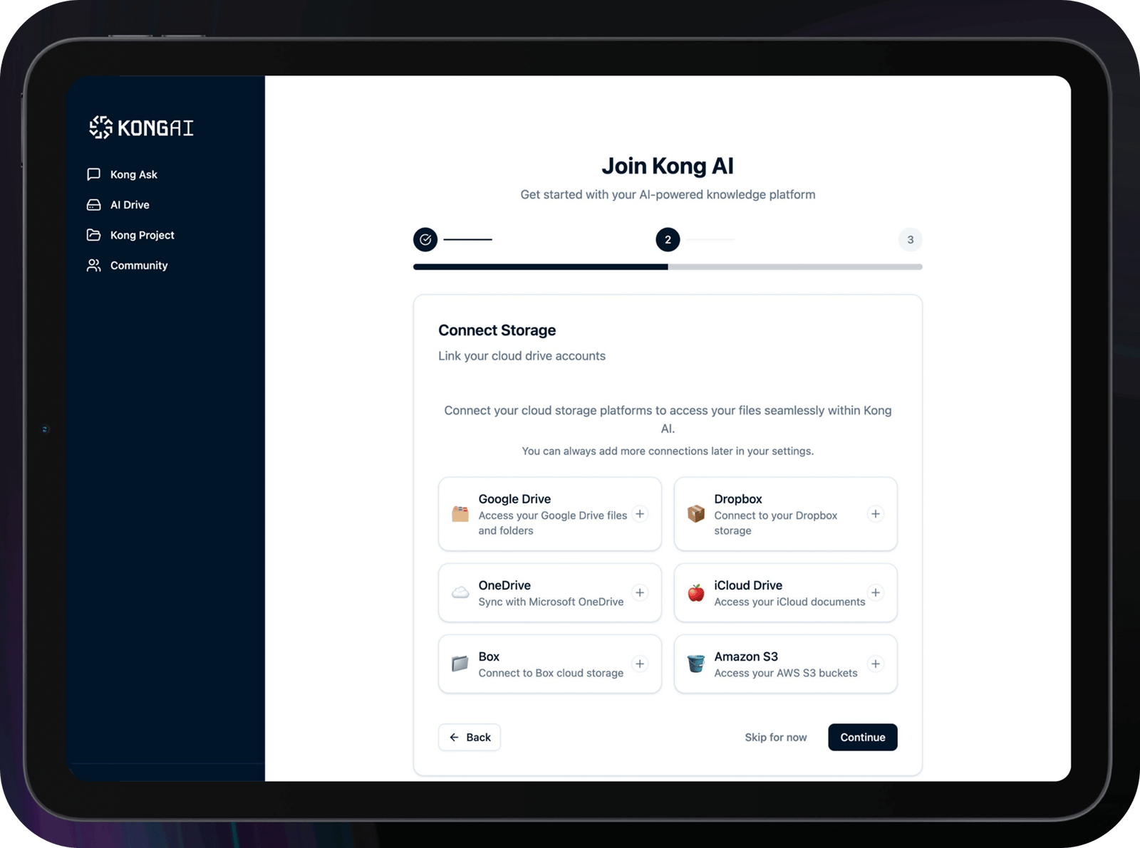 Seamlessly connect your cloud storage accounts like Google Drive, Dropbox, OneDrive, iCloud, Box, and Amazon S3. Import and access your files directly within KLONG AI for a unified, AI-powered workspace.