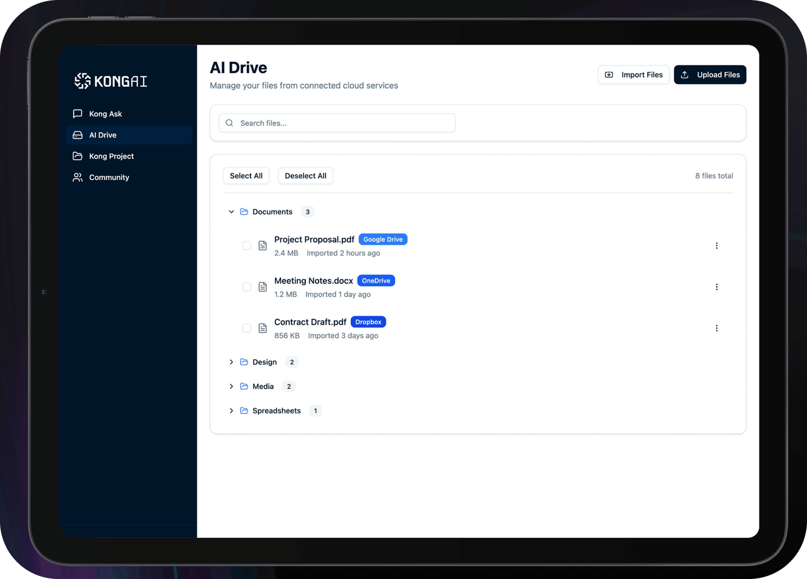 Easily manage and organize all your files from multiple cloud services in one place. Import, upload, search, and access documents, spreadsheets, media, and more—streamlined directly within KLONG AI.