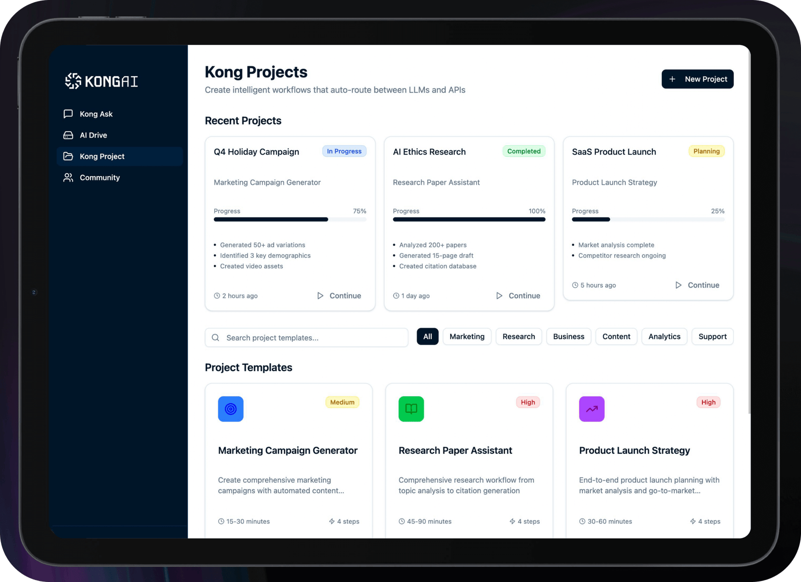 Build and manage intelligent workflows that auto-route between LLMs and APIs. Track progress, explore ready-made templates, and streamline tasks like research, marketing campaigns, and product launches—all in one smart workspace.
