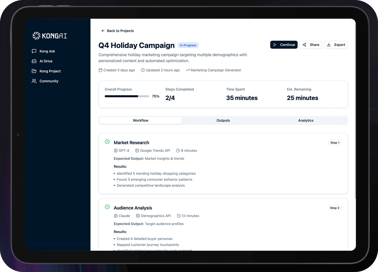 Manage campaigns step by step with AI-powered workflows. Track progress, analyze insights, and generate outputs using multiple LLMs and APIs—from market research to audience analysis—all within a single streamlined project view.