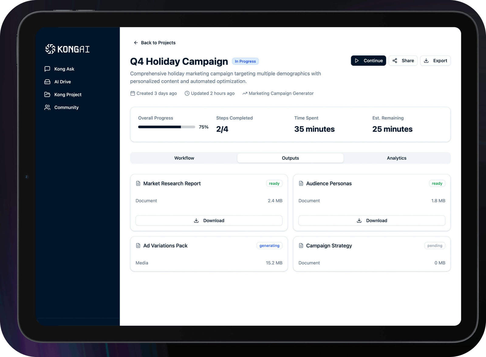 Keep all your project deliverables in one place. From market research reports to audience personas and ad variations, KLONG automatically generates and organizes your campaign files—ready to review, download, or share anytime.